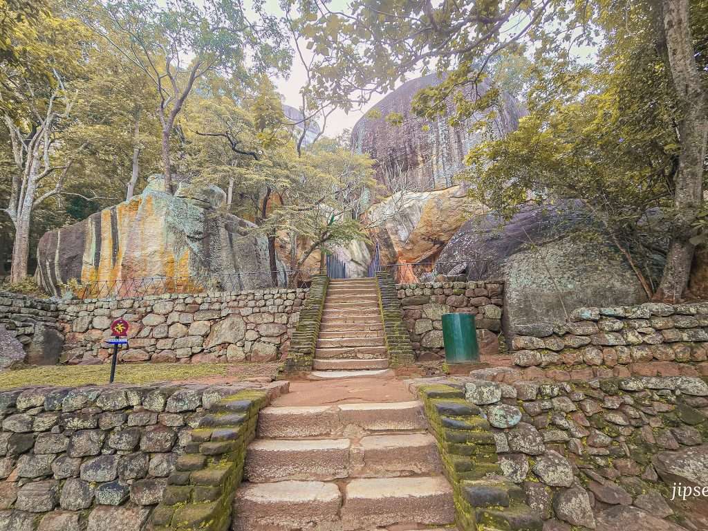 Le sommet du rocher est composé de ruines d’un ancien château. Oui, tu as bien lu : un château au sommet d’un rocher de 200 mètres de haut ! C’était autrefois la forteresse du roi Kasyapa, qui a régné au Ve siècle. Les ruines sont encore bien visibles : on distingue les fondations des pièces, les vestiges de bassins, des escaliers taillés dans la roche…