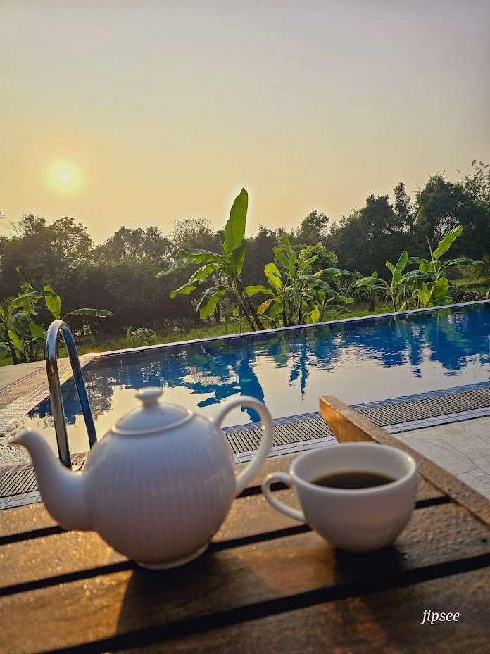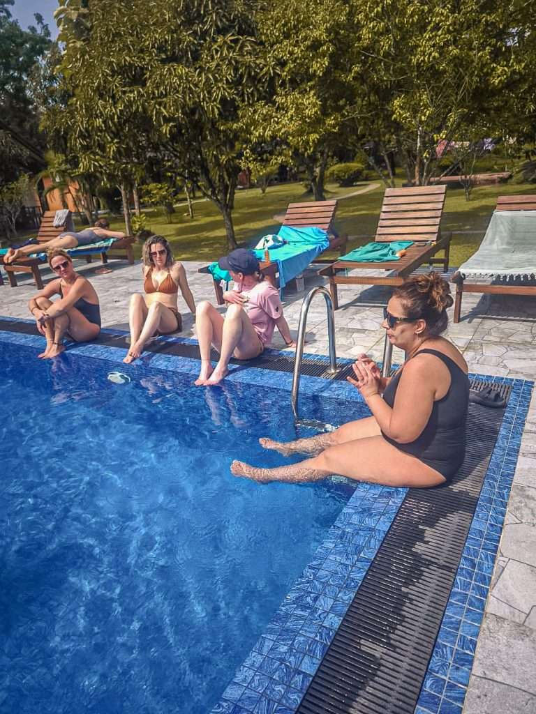 On se pose au bord de la piscine pour déjeuner et débriefer sur notre exploit. On déguste le breakfast préparé par l’hôtel, accompagnés de jus de fruits frais. Et surtout, on refait le film de notre ascension : les moments de peur, les fous rires, la vue incroyable au sommet…