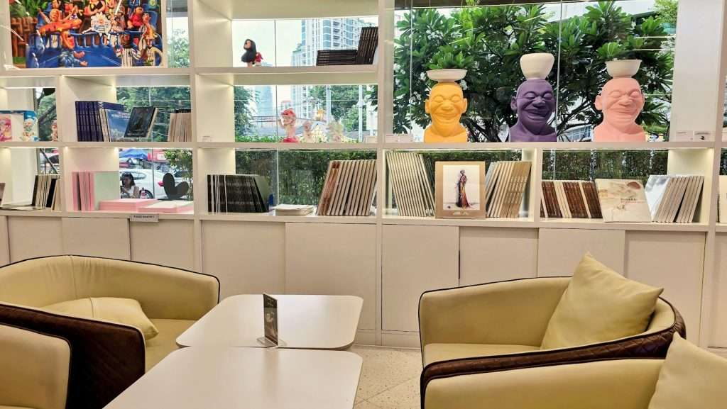 Je commande mon café matinal, bien serré, accompagné d’un petit gâteau maison, et m’installe près d’une fenêtre donnant sur le Chao Phraya. Le fleuve scintille sous la lumière du matin, les bateaux glissent lentement, et le parfum du café se mêle à l’air frais chargé d’odeurs de Bangkok. Autour de moi, étudiants, touristes et amateurs d’art se croisent, chacun absorbé par son univers, mais tous partageant cette atmosphère singulière.