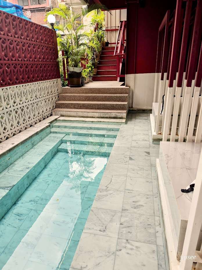 Cette maison, toujours habitée par les descendants de la même famille, est un véritable musée vivant. Dans la cour intérieure, dans le bassin il serait possible de faire un baptème de plongée (oui, tu as bien lu). Le jour de ma visite la piscine était déserte, mais en cherchant il doit être possible de réserver si le coeur t’en dit. Et c’est surtout la preuve que même les lieux historiques à Bangkok savent se réinventer. Les murs racontent l’histoire des marchands chinois venus s’installer ici, les portraits jaunis des ancêtres te fixent depuis les cadres poussiéreux, et chaque recoin semble chuchoter un secret d’un autre siècle.